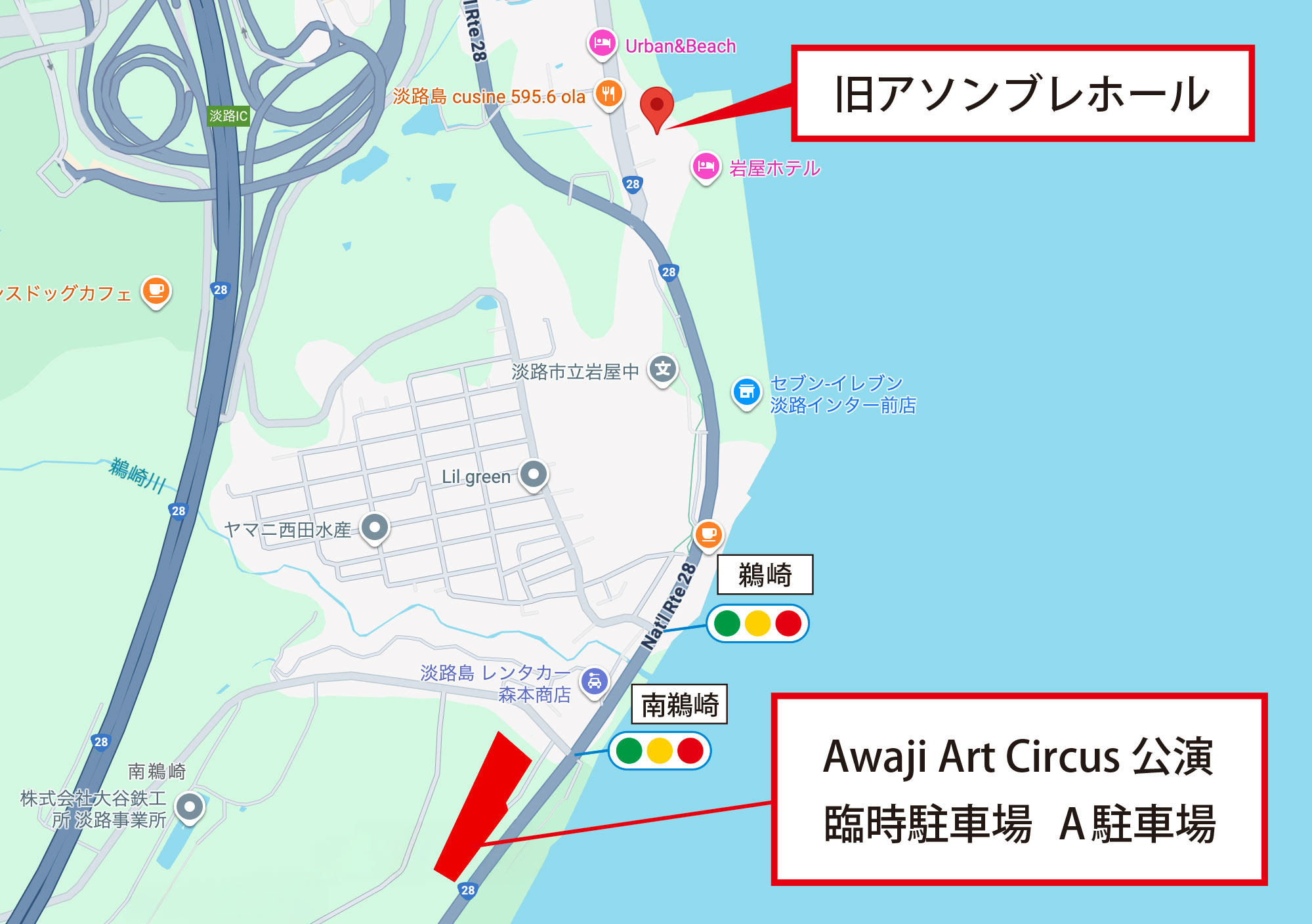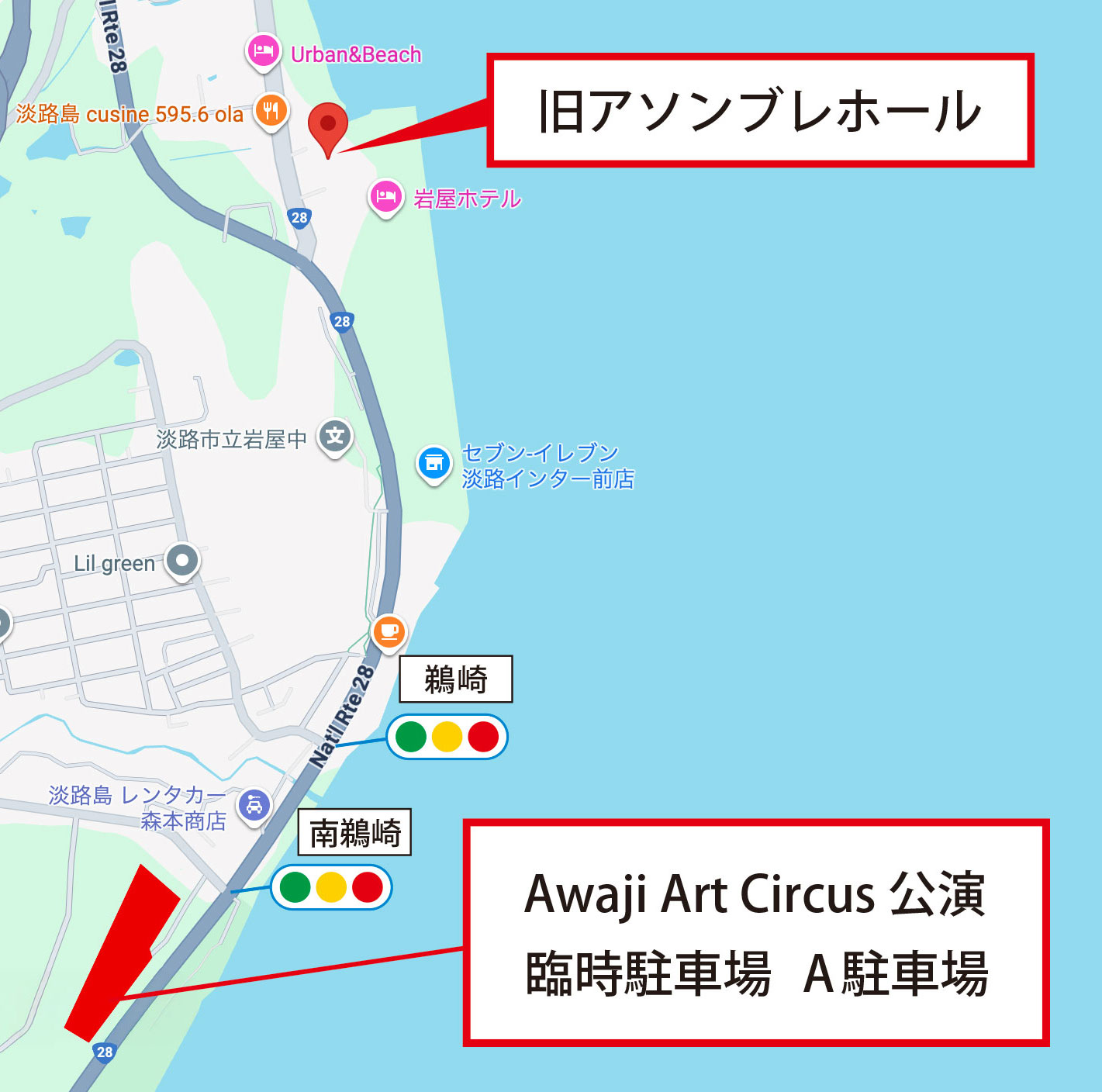 本四海峡バス「大磯号」にて『岩屋中学校前』で降車いただき、徒歩で会場までお越しいただけます。