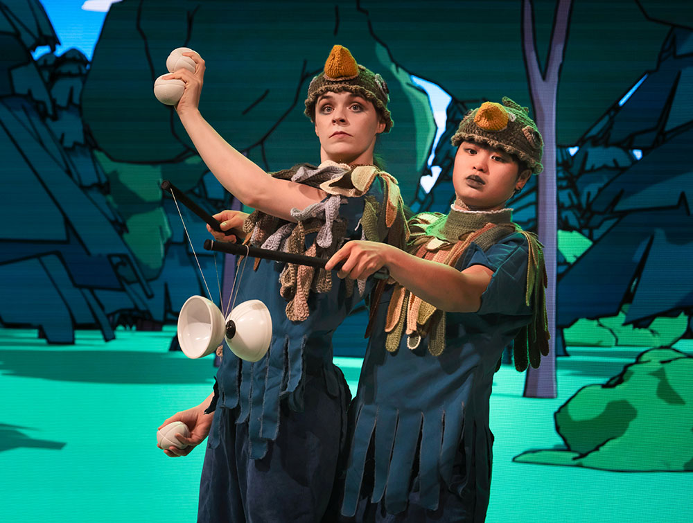 時にはボールとディアボロを同時に、時には2人で1つのボールを、またある時は1組のスティックだけを使い、典型的なボールとディアボロを変形させた独自のパフォーマンスを披露する。もしディアボロを半分に切って、それがボールになるとしたら?ディアボロの棒は食べることができる?なが〜いディアボロのスティックを見たことがある?