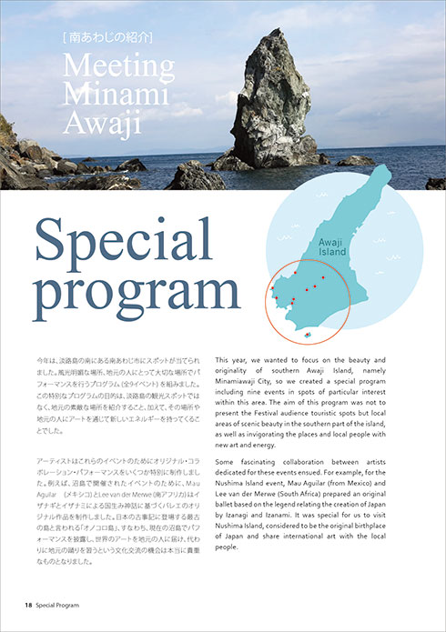 今年は、淡路島の南にある南あわじ市にスポットが当てられました。風光明媚な場所、地元の人にとって大切な場所でパフォーマンスを行うプログラム (全9イベント) を組みました。この特別なプログラムの目的は、淡路島の観光スポットではなく地元の素敵な場所を紹介すること、加えて、その場所や地元の人にアートを通じて新しいエネルギーを与えることでした。