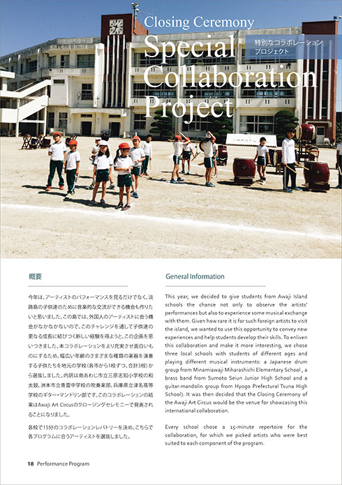 今年は、アーティストのパフォーマンスを見るだけでなく、淡路島の子供達のために音楽的な交流ができる機会も作りたいと思いました。この島では、外国人のアーティストに会う機会がなかなかないので、このチャレンジを通して子供達の更なる成長に結びつく新しい経験を得ようと、この企画を思いつきました。本コラボレーションをより充実させ面白いものにするため、幅広い年齢のさまざまな種類の楽器を演奏する子供たちを地元の学校(各市から1校ずつ、合計3校)から選抜しました。内訳は南あわじ市立三原志知小学校の和太鼓、洲本市立青雲中学校の吹奏楽部、兵庫県立津名高等学校のギター・マンドリン部です。このコラボレーションの結果はAwaji Art Circusのクロージングセレモニーで発表されることになりました。