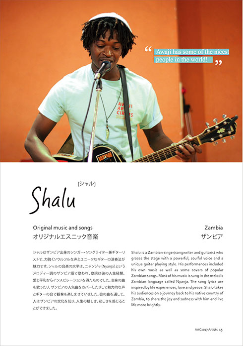 - 例年好評の学校訪問公演。国際交流と文化的な教育を目的に、世界のアーティストが淡路島の地元の小学校・中学校・高校に訪問しパフォーマンスを披露。2017年度はパフォーマンスの披露だけではなく、自分達の母国についてプレゼンテーションを行って(英語、通訳あり)、パフォーマンスを生徒の皆さんが一緒に体験できるワークショッププログラムを実施し、子供達にとって一層世界の文化を感じ理解を深め視野を広げる機会となることを目的としました。