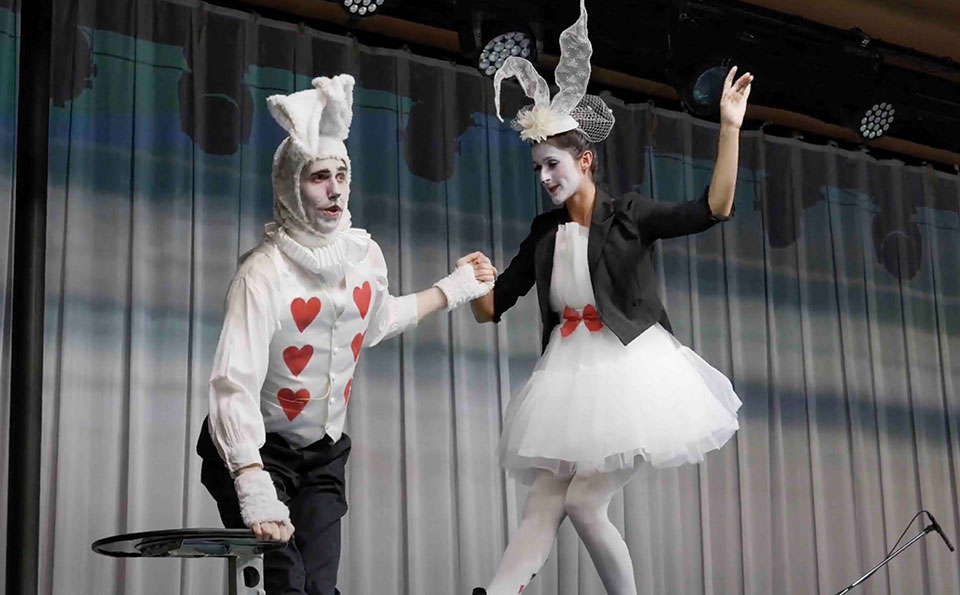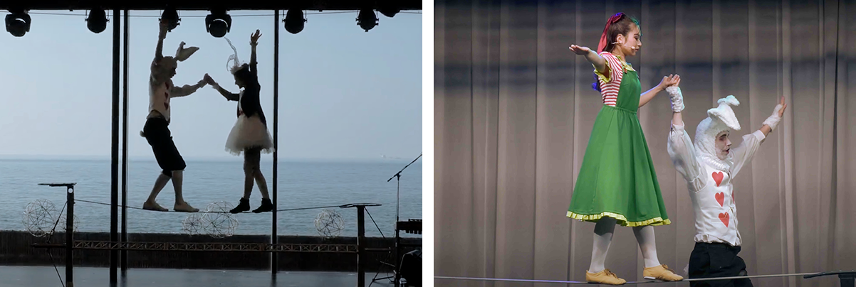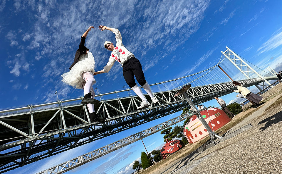 アリスは幸せを探しに、幸せな人がたくさん住んでいる淡路島に行きたかったのですが、行き方が分かりませんでした。困っていると、白いウサギが明石海峡大橋を渡るという行き方を教えてくれました。明石海峡大橋は普段歩行者が通れない場所にはなっていますが、ウサギのようにバランス力が優れていれば、その橋でも渡ることができるということでした!この演目の中では、景色が本当に素晴らしく、世界で2番目に長いつり橋として有名な明石海峡大橋が登場します。