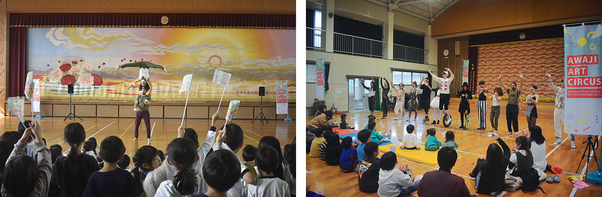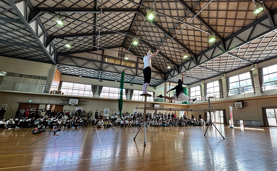 Awaji Art Circusは2016年から学校出張公演を実施。本プログラムを通じて、次世代の文化芸術の理解を深め、子どもたちの視野を広げることを目的としています。同時に「パフォーマー」としての働きや生き方についても理解を広め、様々なパフォーマンスを鑑賞することで、パフォーミングアーツに対する理解が深まることを目指します。