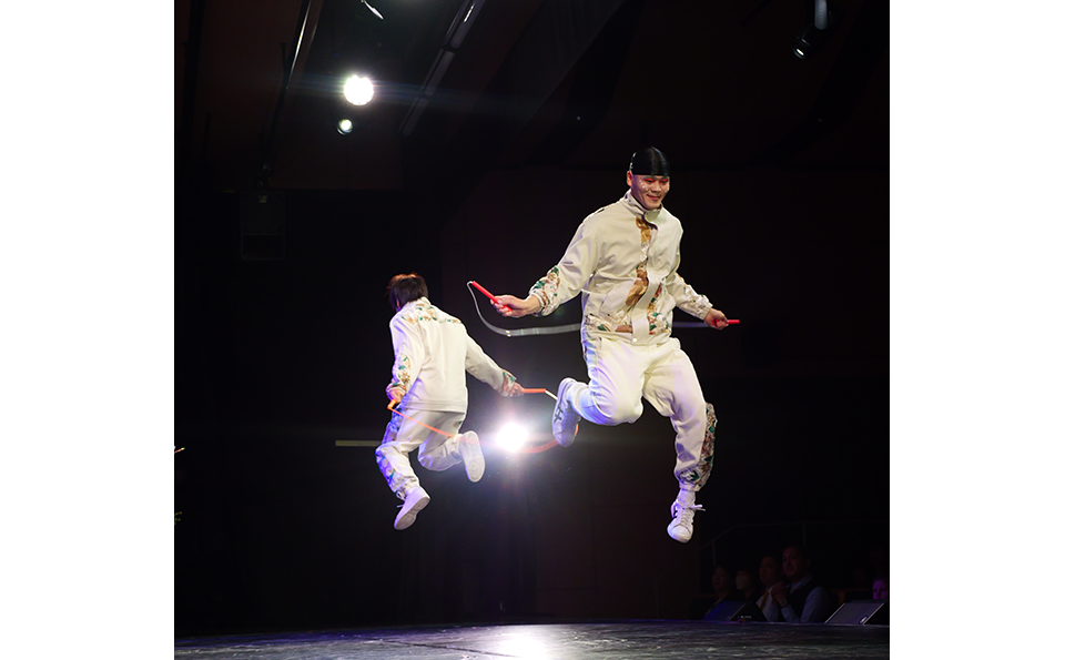 アリスがチェシャ猫と話していると、どこかから大きな音が聞こえてきます。それは淡路島にある花畑、あわじ花さじきでミラクル(不思議な現象)が起こるサイン。本演目では、映像を活用し、あわじ花さじきの綺麗な景色を紹介しながら、エネルギーとパワー溢れる縄跳びのパフォーマンスでミラクルを表現しています。